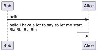 @startuml Bob -> Alice : hello Alice <- Alice : hello I have a lot to say so let me start... \nBla Bla Bla Bla @enduml