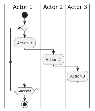 @startuml |Actor 1| start repeat :Action 1; |Actor 2| :Action 2; |Actor 3| :Action 3; |Actor 1| repeat while (Success) is (no) stop @enduml