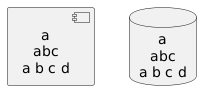 @startuml <style> component { HorizontalAlignment center } database { HorizontalAlignment center } </style> component c [ a abc a b c d ] database d [ a abc a b c d ] @enduml