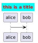 @startuml <style> !$title_color = "#cyan" title { BackGroundColor $title_color FontColor %reverse_color($title_color) } </style> title this is a title endtitle alice->bob @enduml