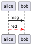 @startuml <style> .a { LineStyle 10 Linecolor red } </style> participant alice alice -> bob : msg alice -> bob <<a>> : red @enduml