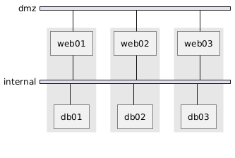 @startuml nwdiag { group { web01; db01; } group { web02; db02; } group { web03; db03; } network dmz { web01; web02; web03; } network internal { web01; db01 ; web02; db02 ; web03; db03; } } @enduml
