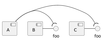 @startuml () foo as foo1 () foo as foo2 [A] -( foo1 [A] -( foo2 [B] -() foo1 [C] -() foo2 @enduml