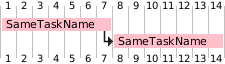 @startgantt [SameTaskName] as [T1] lasts 7 days and is colored in pink [SameTaskName] as [T2] lasts 7 days and is colored in pink [T1] -> [T2] @endgantt