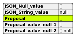 @startjson #highlight "Proposal" { "JSON_Null_value": null, "JSON_String_value": "null", "Proposal": null, "Proposal_value_null_1": "<U+2400>", "Proposal_value_null_2": "<U+2400> null" } @endjson