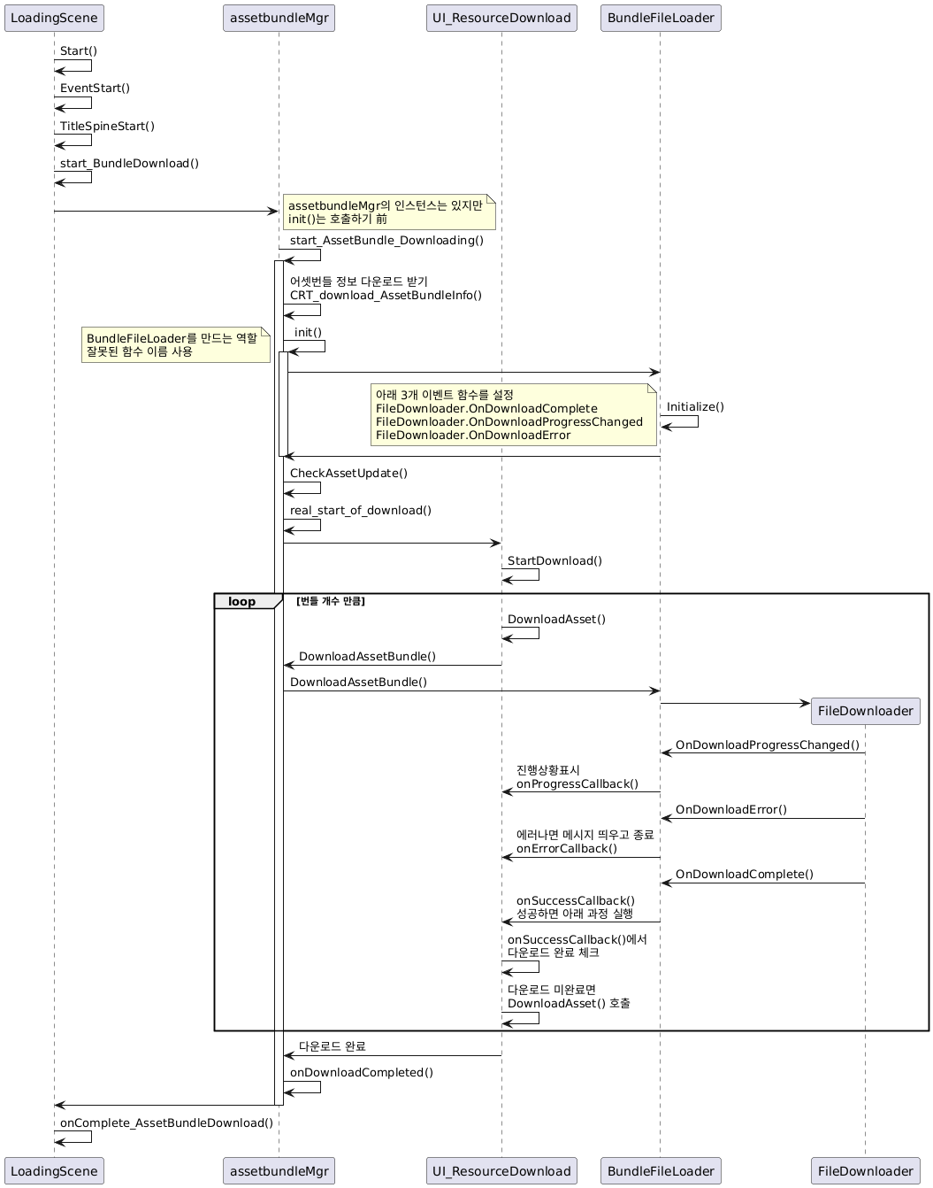 @startuml participant "LoadingScene" as LS participant "assetbundleMgr" as BM participant "UI_ResourceDownload" as UI participant "BundleFileLoader" as FL participant "FileDownloader" as FDL LS->LS: Start() LS->LS: EventStart() LS->LS: TitleSpineStart() LS->LS: start_BundleDownload() LS->BM: note right assetbundleMgr의 인스턴스는 있지만 init()는 호출하기 前 end note BM->BM: start_AssetBundle_Downloading() activate BM BM->BM: 어셋번들 정보 다운로드 받기\nCRT_download_AssetBundleInfo() BM->BM: init() activate BM note left BundleFileLoader를 만드는 역할 잘못된 함수 이름 사용 end note BM->FL: FL->FL: Initialize() note left 아래 3개 이벤트 함수를 설정 FileDownloader.OnDownloadComplete FileDownloader.OnDownloadProgressChanged FileDownloader.OnDownloadError end note FL->BM: deactivate BM BM->BM: CheckAssetUpdate() BM->BM: real_start_of_download() BM->UI: UI->UI: StartDownload() loop 번들 개수 만큼 UI->UI: DownloadAsset() UI->BM: DownloadAssetBundle() BM->FL: DownloadAssetBundle() create FDL FL->FDL: FL<-FDL: OnDownloadProgressChanged() FL->UI: 진행상황표시\nonProgressCallback() FL<-FDL: OnDownloadError() FL->UI: 에러나면 메시지 띄우고 종료\nonErrorCallback() FL<-FDL: OnDownloadComplete() FL->UI: onSuccessCallback()\n성공하면 아래 과정 실행 UI->UI: onSuccessCallback()에서\n다운로드 완료 체크 UI->UI: 다운로드 미완료면\nDownloadAsset() 호출 end UI->BM: 다운로드 완료 BM->BM: onDownloadCompleted() BM->LS: deactivate BM LS->LS: onComplete_AssetBundleDownload() @enduml