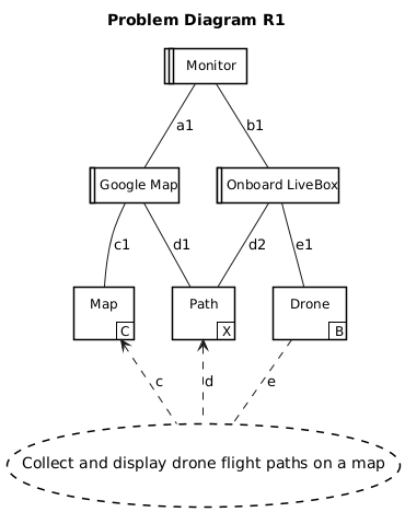 @startuml title Problem Diagram R1 skinparam BiddableBackgroundColor LightBlue skinparam BiddableBorderColor red requirement "Collect and display drone flight paths on a map" as R1 domain "Google Map" as D1 <<Designed>> domain "Onboard LiveBox" as D2 <<Designed>> domain "Drone" as D3 <<Biddable>> domain "Path" as D4 <<Lexical>> domain "Map" as D5 <<Causal>> domain "Monitor" as M <<Machine>> M -- D1: a1 M -- D2: b1 D1 -- D4: d1 D4 <-[dashed]- R1: d D2 -- D3: e1 D3 -[dashed]- R1: e D2 -- D4: d2 D5 <-[dashed]- R1: c D1 -- D5: c1 @enduml