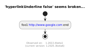 @startuml title 'hyperlinkUnderline false' seems broken... skinparam hyperlinkUnderline false start :foo1 [[http://www.google.com]] end; stop footer \nObserved on: 1.2022.4beta1\n(current version: %version()) @enduml