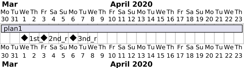 @startgantt scale 2 Project starts the 30 march 2020 [plan1] lasts 25 days [1st_r] happens at 2020/04/01 [2nd_r] happens at 2020/04/03 [3nd_r] happens at 2020/04/06 [1st_r] displays on same row as [2nd_r] [2nd_r] displays on same row as [3nd_r] @endgantt