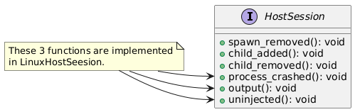 @startuml interface HostSession{ +spawn_removed(): void +child_added(): void +child_removed(): void +process_crashed(): void +output(): void +uninjected(): void } note "These 3 functions are implemented\nin LinuxHostSeesion." as N1 N1 -> HostSession::process_crashed N1 -> HostSession::output N1 -> HostSession::uninjected @enduml