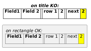 @startuml !global $table = "|= Field1 |= Field 2 |" !procedure $row($value1, $value2) %set_variable_value("$table", %get_variable_value("$table") + "\n| " + $value1 + " | " + $value2 + " |") !endfunction $row("row 1", "2") $row("next", "<#yellow> 2") rectangle r [ <i>on rectangle OK: $table ] title <i>on title KO: $table end title @enduml