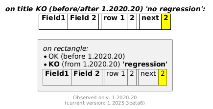 @startuml !global $table = "|= Field1 |= Field 2 |" !procedure $row($value1, $value2) %set_variable_value("$table", %get_variable_value("$table") + "\n| " + $value1 + " | " + $value2 + " |") !endfunction $row("row 1", "2") $row("next", "<#yellow> 2") rectangle r [ <i>on rectangle: * OK (before 1.2020.20) * **KO** (from 1.2020.20) **'regression'** $table ] title <i>on title KO (before/after 1.2020.20) **'no regression'**: $table end title footer Observed on v. 1.2020.20\n(current version: %version()) @enduml