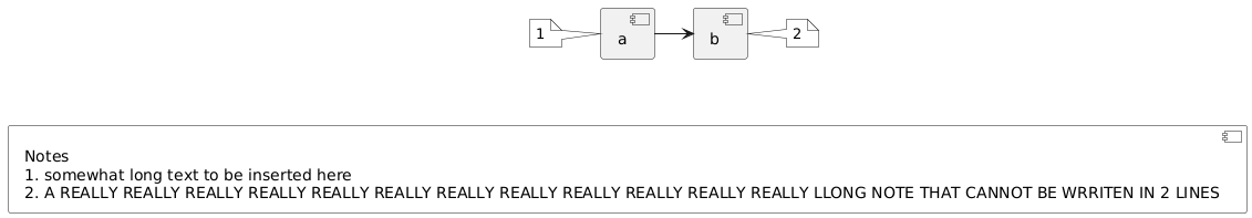 @startuml skinparam BackgroundColor transparent !global $legendText = "Notes" !global $legendIndex = 0 !unquoted procedure $insertNote(position, element, text) !global $legendIndex = $legendIndex + 1 !global $legendText = $legendText + "\n" + $legendIndex + ". " + text note position of element #white $legendIndex end note !endfunction component a component b a -> b $insertNote(left, a, "somewhat long text to be inserted here") $insertNote(right, b, "A REALLY REALLY REALLY REALLY \ REALLY REALLY REALLY REALLY REALLY REALLY REALLY \ REALLY LLONG NOTE THAT CANNOT BE WRRITEN IN 2 LINES") component notes as "$legendText" #white a -[hidden]down-> notes @enduml