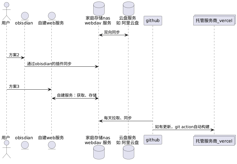 @startuml actor 用户 as user entity "obisdian" as agent0 entity "自建web服务" as agent database "家庭存储nas\nwebdav 服务" as nas database "云盘服务\n如 阿里云盘" as drive participant github as git collections 托管服务商_vercel as vercel nas <-> drive: 双向同步 ||45|| user -> agent0: 方案2 agent0 -> nas: 通过obisdian的插件同步 ||45|| user -> agent: 方案3 agent <-> nas: 自建服务:获取、存储 ||45|| git -> nas: 每天拉取、同步 git -> vercel: 如有更新,git action自动构建 @enduml