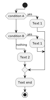 @startuml !pragma useVerticalIf on start if (condition A) then (yes) :Text 1; elseif (condition B) then (yes) :Text 1; else (nothing) :Text 2; endif :Text end; stop @enduml