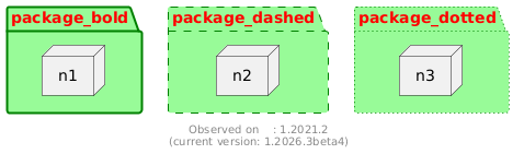 @startuml package package_bold #palegreen;line:green;line.bold;text:red { node n1 } package package_dashed #palegreen;line:green;line.dashed;text:red { node n2 } package package_dotted #palegreen;line:green;line.dotted;text:red { node n3 } footer Observed on : 1.2021.2\n(current version: %version()) @enduml