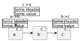 @startuml skinparam linetype ortho 'skinparam linetype polyline component a component b component c a->b: a->b\n|Some Header|\n|Some value|\n b->c: b->c\n|Some Header|\n|Some value|\n c->a: c->a\n|Some Header|\n|Some value|\n @enduml