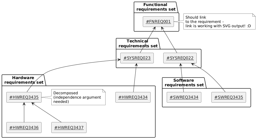 @startuml skinparam monochrome true folder "Functional\n requirements set" { rectangle "[[#FNREQ001]]" as FNREQ001 } folder "Hardware\n requirements set" { rectangle "[[#HWREQ3434]]" as HWREQ3434 rectangle "[[#HWREQ3435]]" as HWREQ3435 note right Decomposed (independence argument needed) endnote rectangle "[[#HWREQ3436]]" as HWREQ3436 rectangle "[[#HWREQ3437]]" as HWREQ3437 } folder "Software\n requirements set" { rectangle "[[#SWREQ3434]]" as SWREQ3434 rectangle "[[#SWREQ3435]]" as SWREQ3435 } folder "Technical\n requirements set" { rectangle "[[#SYSREQ022]]" as SYSREQ022 rectangle "[[#SYSREQ023]]" as SYSREQ023 } SWREQ3434 -u-> SYSREQ022 SWREQ3435 -u-> SYSREQ022 HWREQ3436 -u-> HWREQ3435 HWREQ3437 -u-> HWREQ3435 HWREQ3435 -u-> SYSREQ023 HWREQ3434 -u-> SYSREQ023 SYSREQ022 -u-> FNREQ001 SYSREQ023 -u-> FNREQ001 note right of FNREQ001 Should link to the requirement - link is working with SVG output! :D endnote @enduml