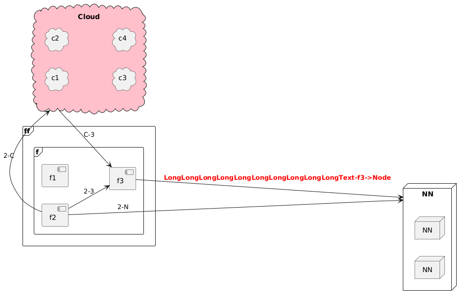 @startuml left to right direction cloud "Cloud" as C #pink { cloud "c1" as c1 cloud "c2" as c2 cloud "c3" as c3 cloud "c4" as c4 } frame "ff" as ff { frame "f" as f { [f1] [f2] [f3] } } node "NN" as N { node "NN" as N1 node "NN" as N2 } C <- f2 : 2-C C --> f3 : C-3 f2 --> f3 : 2-3 f3 --> N : <b><color:red>LongLongLongLongLongLongLongLongLongLongText-f3->Node f2 --> N : 2-N @enduml