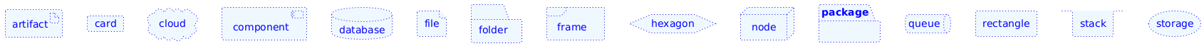 @startuml artifact artifact #aliceblue;line:blue;line.dotted;text:blue { } card card #aliceblue;line:blue;line.dotted;text:blue { } cloud cloud #aliceblue;line:blue;line.dotted;text:blue { } component component #aliceblue;line:blue;line.dotted;text:blue { } database database #aliceblue;line:blue;line.dotted;text:blue { } file file #aliceblue;line:blue;line.dotted;text:blue { } folder folder #aliceblue;line:blue;line.dotted;text:blue { } frame frame #aliceblue;line:blue;line.dotted;text:blue { } hexagon hexagon #aliceblue;line:blue;line.dotted;text:blue { } node node #aliceblue;line:blue;line.dotted;text:blue { } package package #aliceblue;line:blue;line.dotted;text:blue { } queue queue #aliceblue;line:blue;line.dotted;text:blue { } rectangle rectangle #aliceblue;line:blue;line.dotted;text:blue { } stack stack #aliceblue;line:blue;line.dotted;text:blue { } storage storage #aliceblue;line:blue;line.dotted;text:blue { } @enduml
