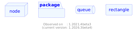 @startuml node node #aliceblue;line:blue;line.dotted;text:blue { } package package #aliceblue;line:blue;line.dotted;text:blue { } queue queue #aliceblue;line:blue;line.dotted;text:blue { } rectangle rectangle #aliceblue;line:blue;line.dotted;text:blue { } footer Observed on : 1.2021.4beta3\n(current version: %version()) @enduml