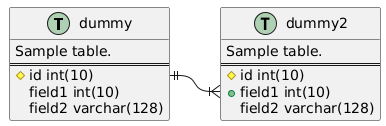 @startuml hide stereotypes skinparam stereotypeC<< table >> { BackgroundColor #FFAAAA } skinparam spotChar<< table >> T class dummy << table >> { Sample table. == # id int(10) field1 int(10) field2 varchar(128) } class dummy2 << table >> { Sample table. == # id int(10) + field1 int(10) field2 varchar(128) } dummy::id ||-|{ dummy2::field1 @enduml