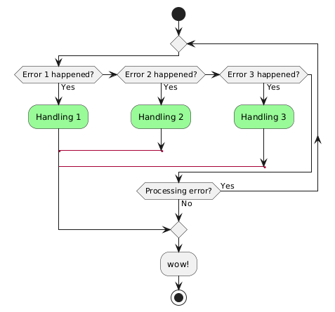 @startuml start repeat if (Error 1 happened?) then (Yes) #palegreen:Handling 1; label l break else if (Error 2 happened?) then (Yes) #palegreen:Handling 2; goto l else if (Error 3 happened?) then (Yes) #palegreen:Handling 3; label dummyspace goto l endif repeat while (Processing error?) is (Yes) not (No) :wow!; stop @enduml