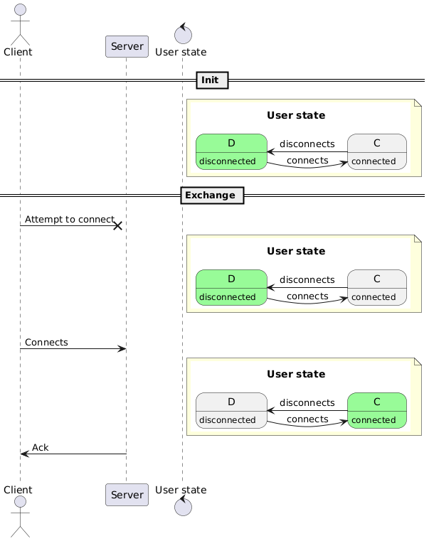 @startuml actor Client as C participant Server as S control "User state" as U !procedure $UserState() title User state D : disconnected C : connected D -> C : connects C -> D : disconnects !end procedure == Init == note right U {{ $UserState() state D #palegreen }} end note == Exchange == C -x S : Attempt to connect note right U {{ $UserState() state D #palegreen }} end note ||| C -> S : Connects note right U {{ $UserState() state C #palegreen }} end note S -> C : Ack ||| @enduml
