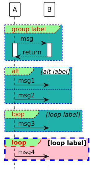 @startuml scale 1.5 hide footbox <style> sequenceDiagram { participant { BackGroundColor white LineThickness 1 } group { FontStyle italic FontSize 13 LineThickness 1 LineColor blue LineStyle 3 BackGroundColor LightSeaGreen } groupHeader { FontStyle plain FontColor red BackGroundColor palegreen LineColor maroon LineStyle 3 } } </style> participant A participant B group group label A-->B : msg activate A activate B A<--B : return deactivate A deactivate B end group alt <back:white>alt label A -> B : msg1 else A -> B : msg2 end alt loop <back:LightSeaGreen>loop label A -> B : msg3 end loop <style> sequenceDiagram { group { FontStyle bold LineThickness 3 LineColor blue LineStyle 10 BackGroundColor pink } groupHeader { FontStyle bold FontColor red BackGroundColor palegreen LineColor red LineStyle 10 } } </style> loop <back:white>loop label A -> B : msg4 end loop @enduml