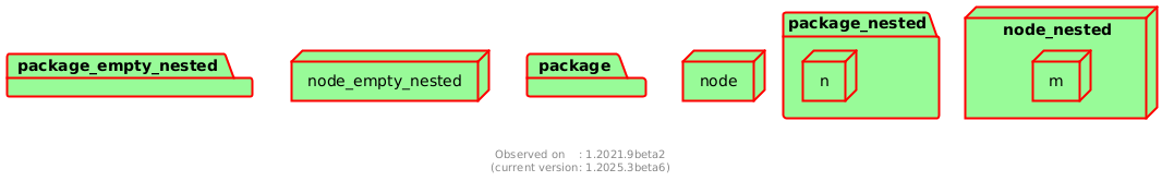 @startuml <style> node { BackGroundColor palegreen LineThickness 2 LineColor red } package { BackGroundColor palegreen LineThickness 2 LineColor red } </style> package package package package_empty_nested { } package package_nested { node n } node node node node_empty_nested { } node node_nested { node m } footer \nObserved on : 1.2021.9beta2\n(current version: %version()) @enduml