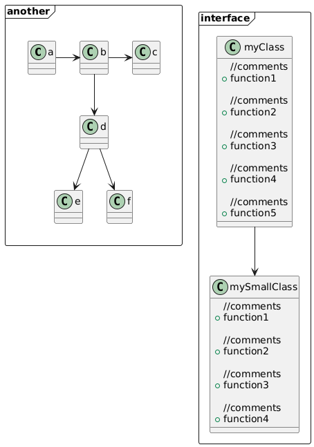 @startuml frame another { label l [ {{ class a a->b b->c b-->d d-->e d-->f }} ] } frame interface{ class myClass{ //comments +function1 //comments +function2 //comments +function3 //comments +function4 //comments +function5 } class mySmallClass{ //comments +function1 //comments +function2 //comments +function3 //comments +function4 } myClass --> mySmallClass } @enduml