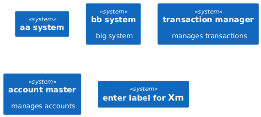 @startuml !unquoted procedure $app($id) !includeurl https://raw.githubusercontent.com/RicardoNiepel/C4-PlantUML/release/1-0/C4_Container.puml !$data={"participants" :[ {"id": "cm" ,"label": "customer master","desc": "manages customers"}, {"id": "tm" ,"label": "transaction manager","desc": "manages transactions"}, {"id": "am" ,"label": "account master","desc": "manages accounts"} ] } !$id_exist = %false() !foreach $part in $data.participants !if $part.id == $id !$id_exist = %true() !if $INCLUDE_DESC System($part.id, $part.label, $part.desc) !else System($part.id, $part.label) !endif !endif !endfor !if %not($id_exist) System($id, "enter label for <u:red>$id") !endif !endprocedure !includeurl https://raw.githubusercontent.com/RicardoNiepel/C4-PlantUML/release/1-0/C4_Container.puml %set_variable_value("$INCLUDE_DESC", %true()) System(aa, "aa system") System(bb, "bb system", "big system") $app(tm) $app(am) $app(Xm) @enduml
