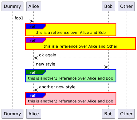 @startuml <style> sequenceDiagram { reference { LineColor red BackGroundColor yellow LineThickness 2.0 } referenceHeader { LineColor red BackGroundColor blue FontStyle bold } } </style> Dummy -> Alice : foo1 ref over Alice, Bob : this is a reference over Alice and Bob ref#7700FF over Alice, Other, Bob : this is a reference over Alice and Other Other --> Alice : ok again Alice -> Bob : new style <style> sequenceDiagram { reference { LineColor blue BackGroundColor palegreen LineThickness 2.0 } referenceHeader { LineColor blue BackGroundColor green FontStyle bold FontColor white } } </style> ref over Alice, Bob : this is another1 reference over Alice and Bob Alice <- Bob : another new style <style> sequenceDiagram { reference { LineColor red BackGroundColor pink LineThickness 2.0 } referenceHeader { LineColor red BackGroundColor blue FontStyle bold } } </style> ref over Alice, Bob : this is another2 reference over Alice and Bob @enduml