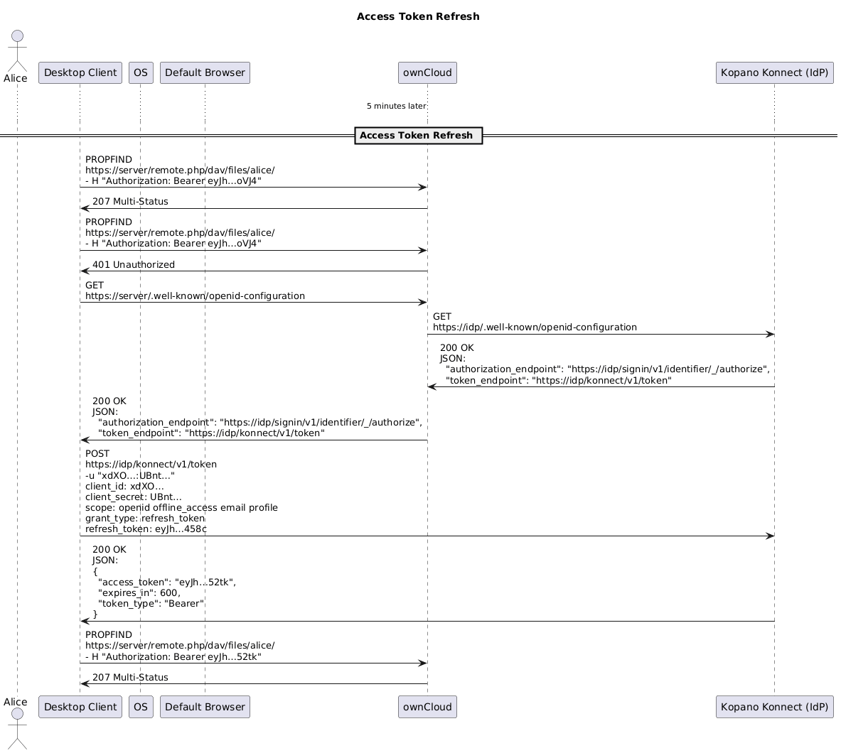 @startuml title Access Token Refresh actor Alice participant Client as "Desktop Client" participant OS participant Browser as "Default Browser" participant ownCloud participant IdP as "Kopano Konnect (IdP)" ...5 minutes later... == Access Token Refresh == Client -> ownCloud : PROPFIND\nhttps://server/remote.php/dav/files/alice/\n- H "Authorization: Bearer eyJh…oVJ4" Client <- ownCloud : 207 Multi-Status Client -> ownCloud : PROPFIND\nhttps://server/remote.php/dav/files/alice/\n- H "Authorization: Bearer eyJh…oVJ4" Client <- ownCloud : 401 Unauthorized Client -> ownCloud : GET\nhttps://server/.well-known/openid-configuration ownCloud -> IdP : GET\nhttps://idp/.well-known/openid-configuration ownCloud <- IdP : 200 OK\nJSON:\n "authorization_endpoint": "https://idp/signin/v1/identifier/_/authorize",\n "token_endpoint": "https://idp/konnect/v1/token" Client <- ownCloud : 200 OK\nJSON:\n "authorization_endpoint": "https://idp/signin/v1/identifier/_/authorize",\n "token_endpoint": "https://idp/konnect/v1/token" Client -> IdP : POST\nhttps://idp/konnect/v1/token\n-u "xdXO…:UBnt…"\nclient_id: xdXO…\nclient_secret: UBnt…\nscope: openid offline_access email profile\ngrant_type: refresh_token\nrefresh_token: eyJh…458c Client <- IdP : 200 OK\nJSON:\n{\n "access_token": "eyJh…52tk",\n "expires_in": 600,\n "token_type": "Bearer"\n} Client -> ownCloud : PROPFIND\nhttps://server/remote.php/dav/files/alice/\n- H "Authorization: Bearer eyJh…52tk" Client <- ownCloud : 207 Multi-Status @enduml