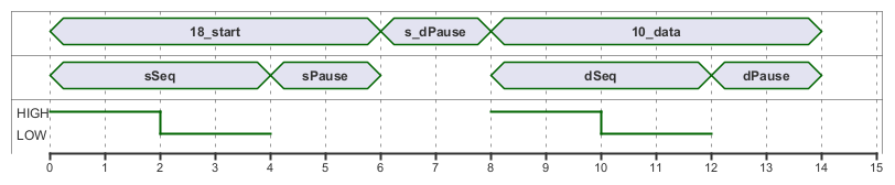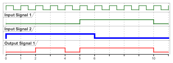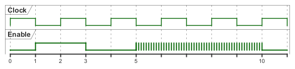 clocked stellt eine Rechtecksignal für den Teilnehmer dar. Mit period wird die Frequenz für den Statuswechsel festgelegt (Muss-Angabe). Mit offset kann der Startzeitpunkt des ersten Signals festgelegt werden. Mit pulse kann die länge des Statusimpulses festgelegt werden