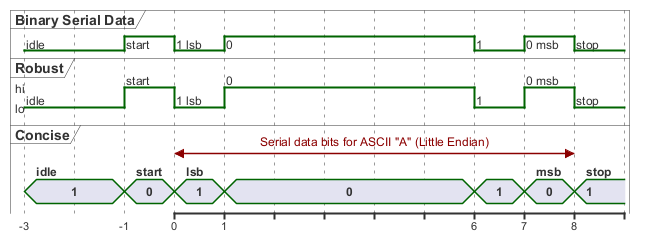 @0 <-> @8 : Serial data bits for ASCII "A" (Little Endian)