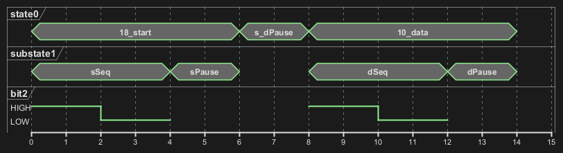 @0 <-> @8 : Serial data bits for ASCII "A" (Little Endian)