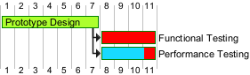 This gantt diagram shows how to visually distinguish task statuses (such as unstarted or undone) by applying different background and line colors.