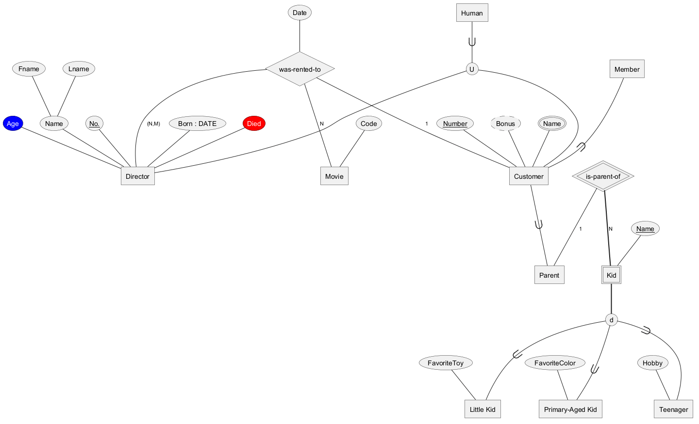 Entities, attributes and relationships can be given aliases to make the diagram more readable.