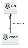 Car "1" *-- "*" Wheel : [[http://plantuml.com/class-diagram has some]]