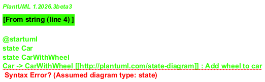 Car -> CarWithWheel [[http://plantuml.com/state-diagram]] : Add wheel to car