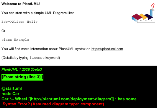 Car *-- Wheel [[http://plantuml.com/deployment-diagram]] : has some