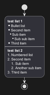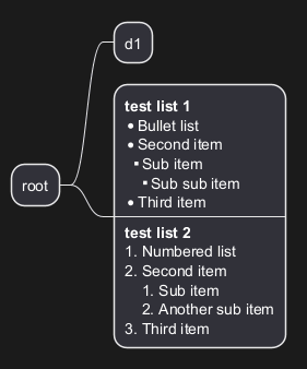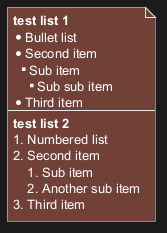 Vous pouvez utiliser des listes numérotées et à puces dans le texte des nœuds, les notes, etc.