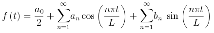 f(t)=(a_0)/2 + sum_(n=1)^ooa_ncos((npit)/L)+sum_(n=1)^oo b_n\ sin((npit)/L)