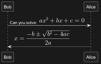 Alice --> Bob: <math>x = (-b+-sqrt(b^2-4ac))/(2a)</math>