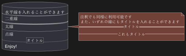 state "You can have horizontal line\n----\nOr double line\n====\nOr strong line\n____\nOr dotted line\n..My title..\n//and title... //\n==Title==\n--Another title--\nEnjoy!" as a {