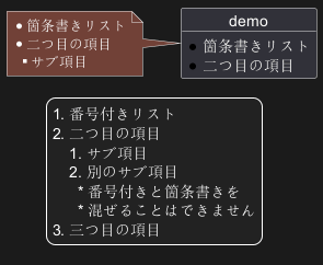 ノードのテキストや注釈の中で、番号付きリストと箇条書きリストを使用できます。