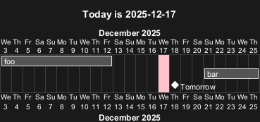 [bar] requires 5 days and starts %date("YYYY-MM-dd", $now + 4*24*3600)