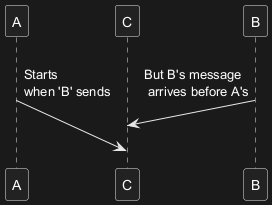 & B ->(25) C: \nBut B's message\n arrives before A's