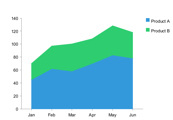 Area charts are similar to line charts but with filled regions: